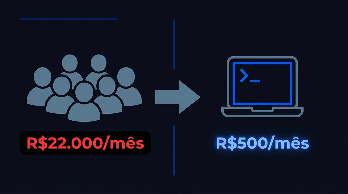| Custo mensal | R$22.000 (6 pessoas) | R$100–500 (plano Claude) |